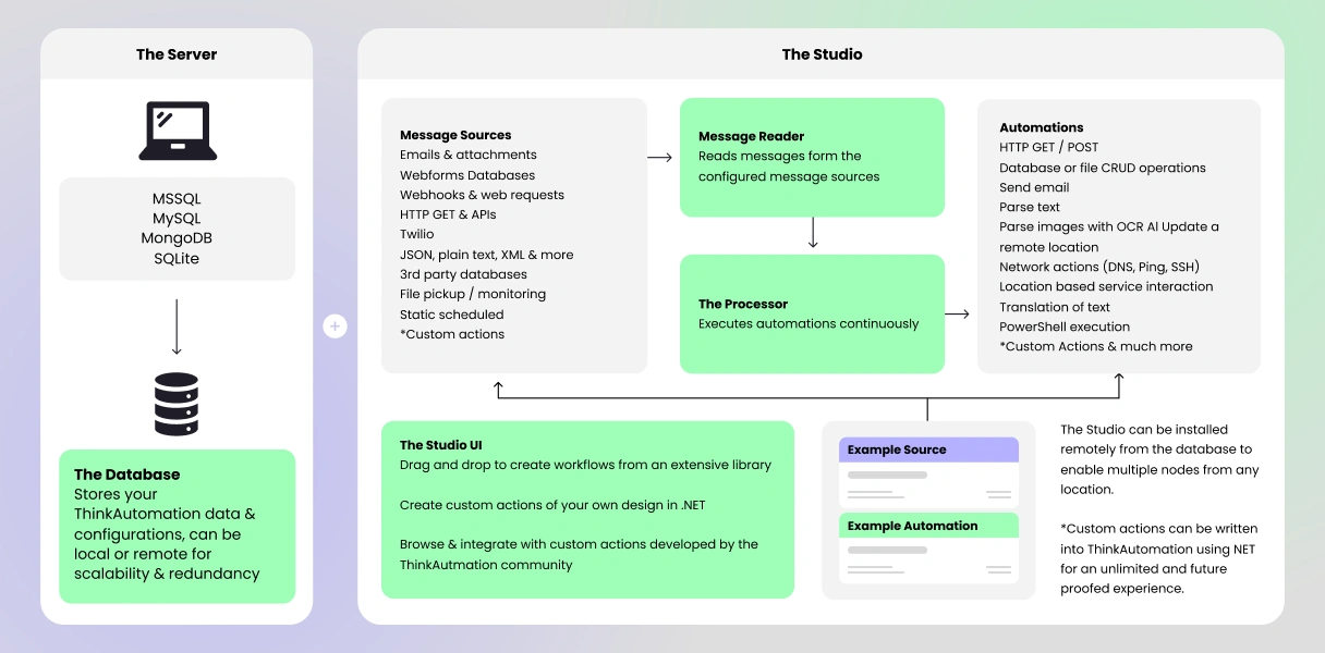 The ThinkAutomation Studio is used to configure your message source triggers and to build and test your automation workflows. It can also be used to view the Message Store of processed messages and to configure Custom Actions. You can run the Studio on the same computer running the ThinkAutomation Server or on any remote computer that can connect to it.