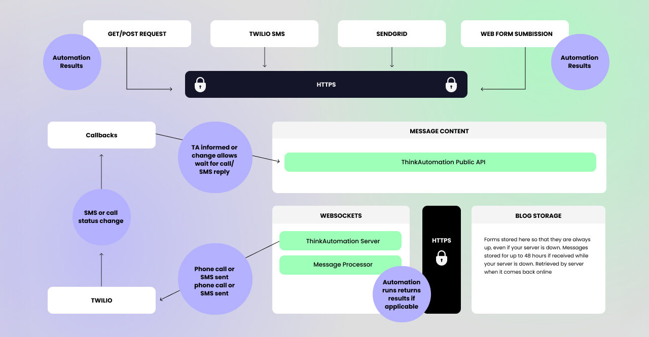 ThinkAutomation provides a public Web API that acts as a secure tunnel between web resources and your on-premises or self-hosted ThinkAutomation instance. When your ThinkAutomation Server starts, it makes a secure outbound connection to the ThinkAutomation Web API Gateway server. This allows your ThinkAutomation Server to receive public HTTP requests without being publicly accessible itself.